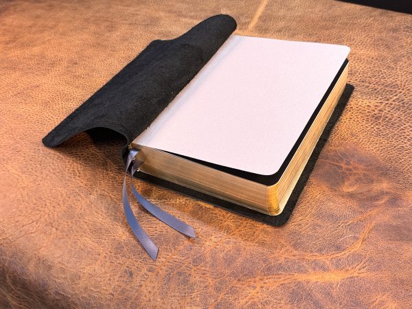 This exquisite Leather Bible combines rugged elegance with functionality, draped in premium black cowhide leather. This oil-tanned leather has an attractive grain that provides great character, and the oil tanning process adds toughness and durability. It’s more than just a leather Bible; it’s a testament to outstanding craftsmanship, featuring textured ivory end sheets and charcoal gray satin ribbons.