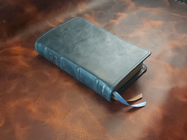 Both Bibles are lovingly hand-crafted using a distressed black leather specially dyed with waxes and resins that give the surface a natural distressed look while preserving its toughness and durability. This cover is matched with one of our softest cowhides – a desert tan leather that is sourced in Argentina and has a light pebble texture. The beauty and durability of these Bibles is enhanced with an Egyptian blue hand-stitched perimeter, steel blue and camel tan ribbons, and slate blue end sheets.