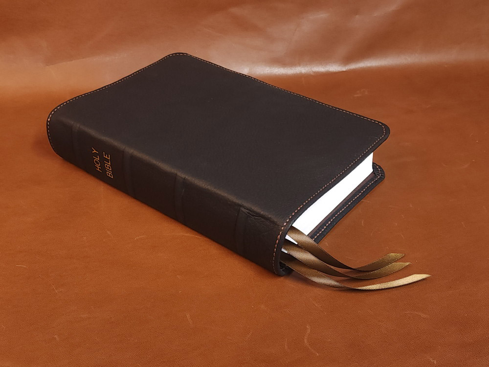 This opulent leather Bible has been masterfully hand-rebound with a premium black cowhide cover, a chocolate brown calfskin liner and a hand-sewn brown perimeter stitch. The cowhide cover has the soft, supple feel of deerskin and the toughness and durability of cowhide. The calfskin liner is distinguished by its natural pebble grain that enhances both its visual character and tactile depth. Designed to age beautifully over time, the cowhide and calfskin strike a sophisticated balance between refined finish and rugged durability. Adding to this Bible’s beauty are chocolate brown end sheets, four ribs, gold spine stamping, and three brown satin ribbons!