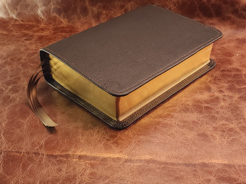 We offer many different Bible editions in several different designs, but we haven’t made every design for every Bible edition we sell (yet!). This means the pictures we display are meant to highlight the custom handcrafted cover rather than the text pages of the Bible (aka the text block) itself. The Bible edition that we’ve crafted the cover for may be different than the Bible edition we’re selling, with different page gilding, thumb-indexing tabs, size, thickness, or other features. As often as we can, we use pictures from Bibles editions with similar features to the Bible editions we’re listing.