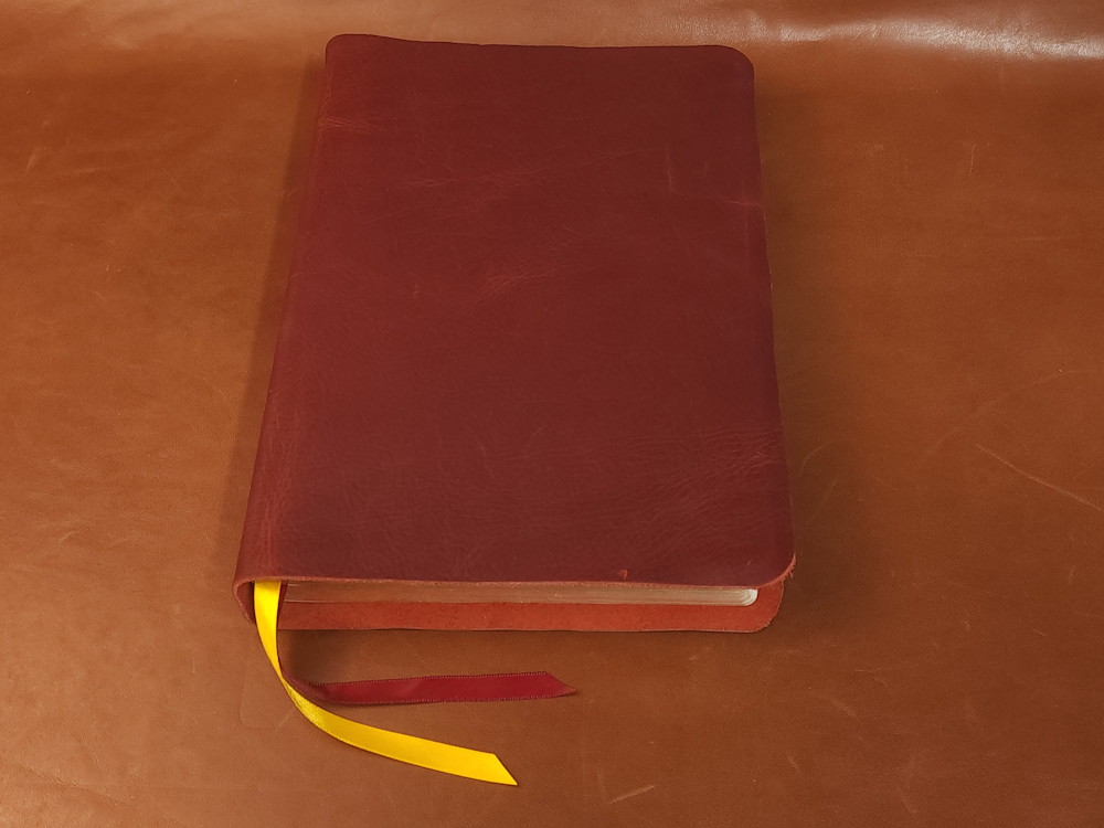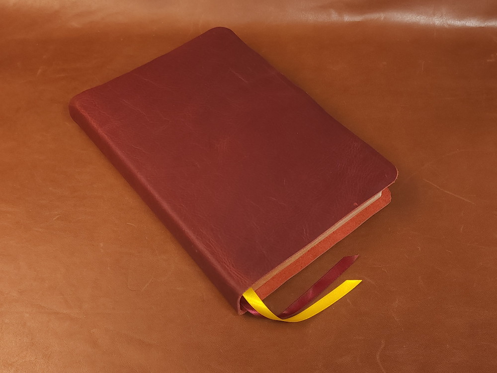 Discover the world of the Bible in a whole new way with our custom leather ESV Study Bible. This exquisite Leather Bible combines rugged elegance with functionality, draped in premium red cowhide leather. This oil-tanned leather has an attractive grain that provides great character, and the oil tanning process adds toughness and durability.  It’s more than just a leather Bible; it’s a testament to outstanding craftsmanship, featuring textured ivory end sheets, and gold and maroon satin ribbons.