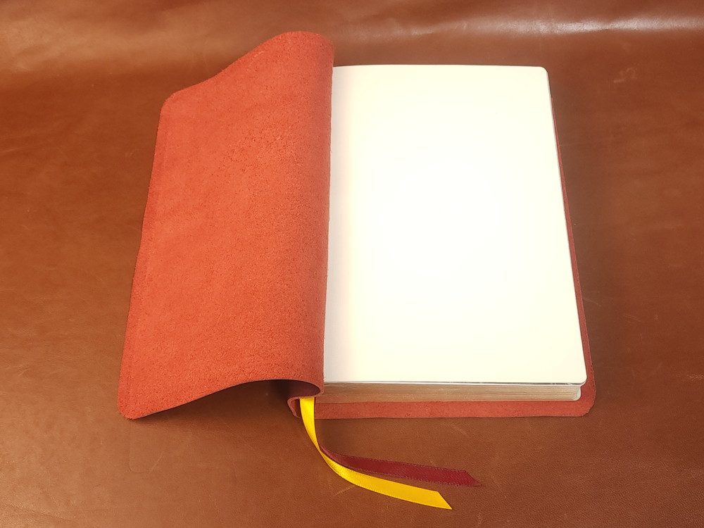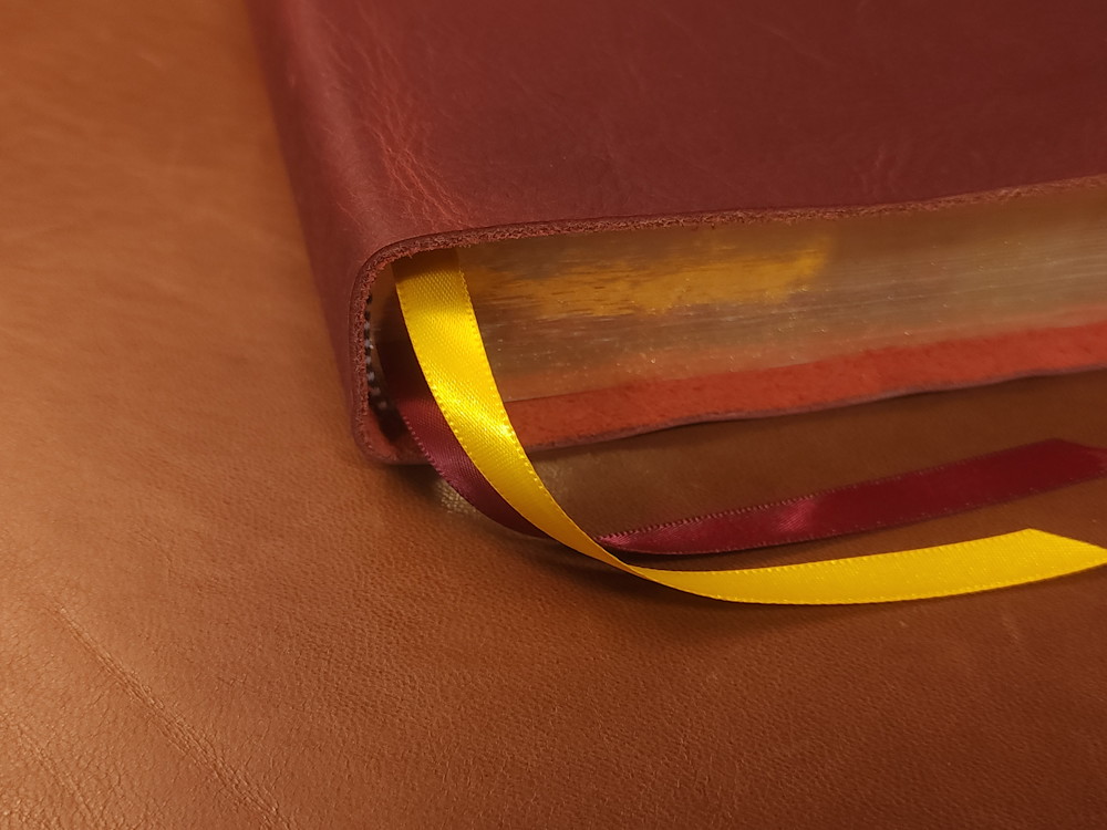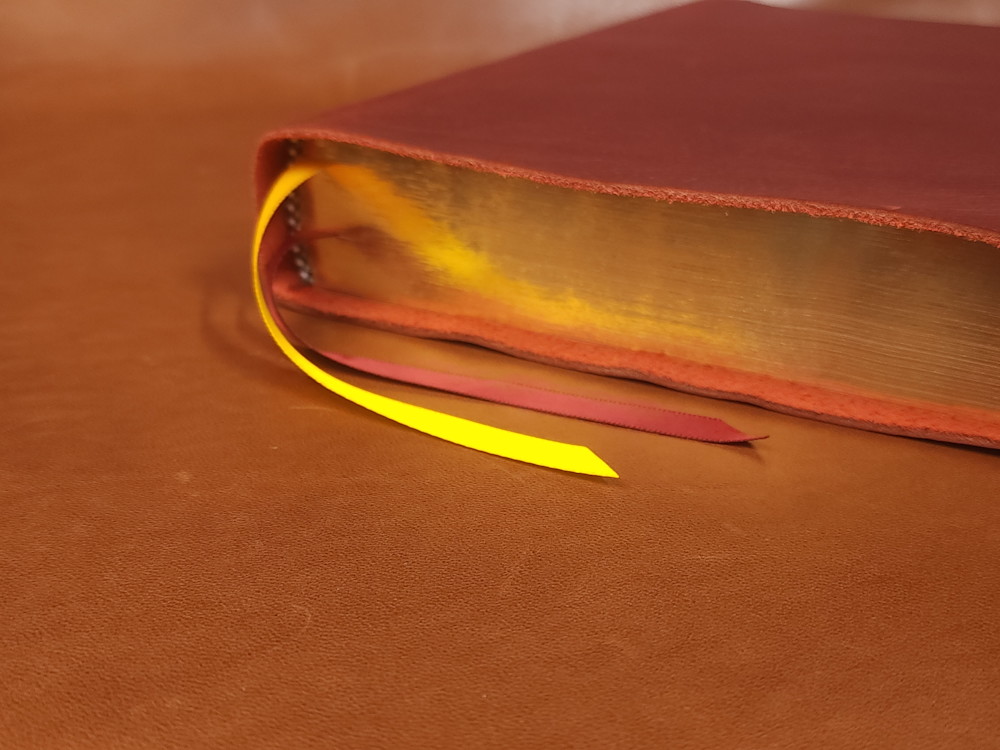We offer many different Bible editions in several different designs, but we haven’t made every design for every Bible edition we sell (yet!).  This means the pictures we display are meant to highlight the custom handcrafted cover rather than the text pages of the Bible (aka the text block) itself.  The Bible edition that we’ve crafted the cover for may be different than the Bible edition we’re selling, with different page gilding, thumb-indexing tabs, size, thickness, or other features.  As often as we can, we use pictures from Bibles editions with similar features to the Bible editions we’re listing.
