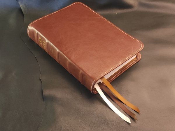 Discover the world of the Bible in a whole new way with our custom leather ESV Study Bible. This stunning leather Bible has been masterfully hand-rebound with our antique brown sheepskin cover. This beautiful veg-tanned sheepskin, which comes from Greece, has a slightly pull-up aniline two-tone effect. It is matched with a smooth pull up tan cowhide liner and a hand-sewn light tan perimeter stitch. Adding to its beauty are ivory end sheets, five ribs, gold spine stamping, and ivory, spice gold, and brown ribbons!