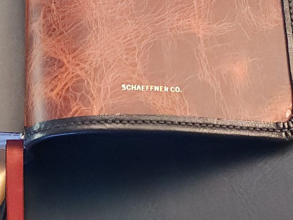 This cover, the first in Schaeffner Co’s Capra Lux by Schaeffner Co line, includes a natural drum-dyed black vegetable-tanned goatskin, Badalassi Carlo Olmo waxed Italian cowhide liner, hand-sewn black perimeter stitching, gold spine stamping, and black, rust, and camel tan satin ribbons.