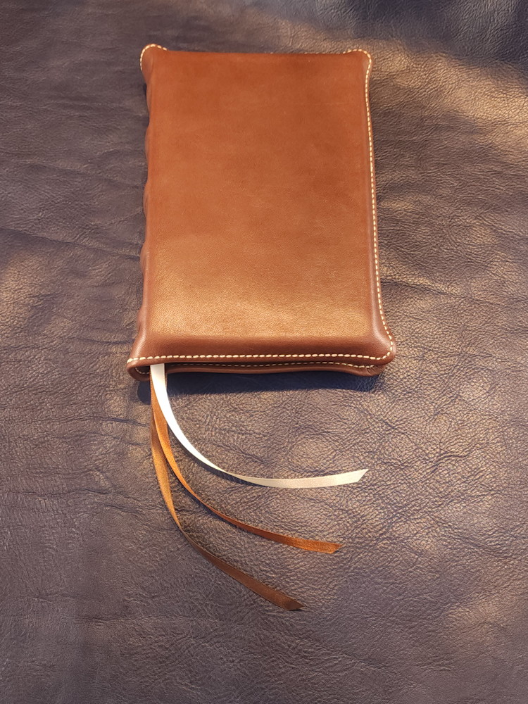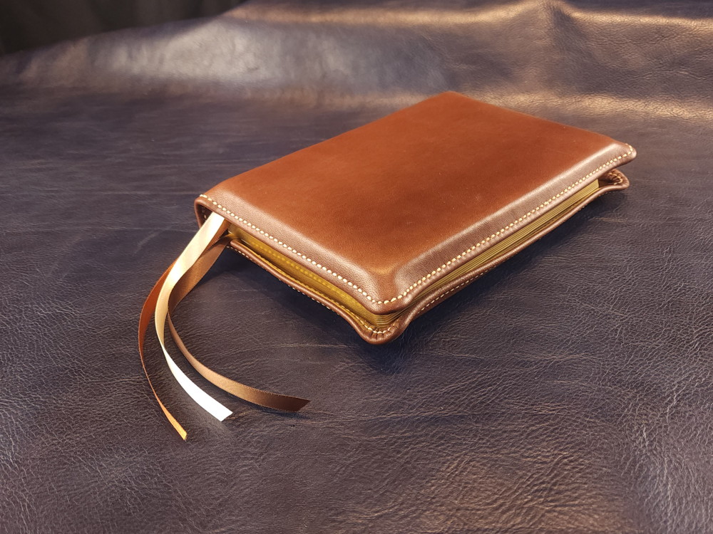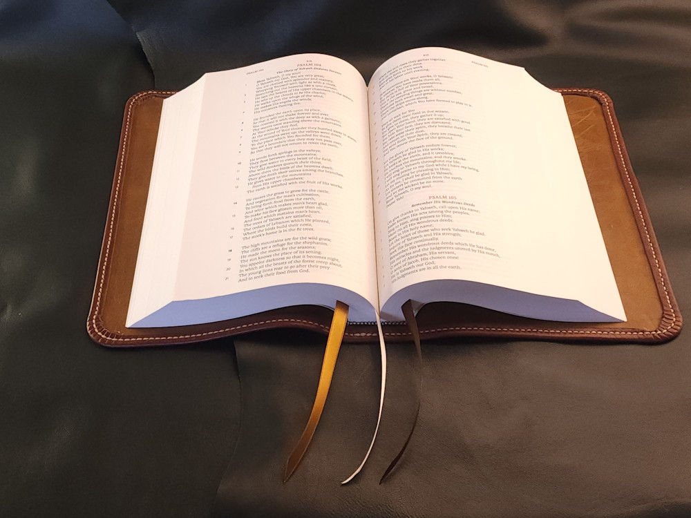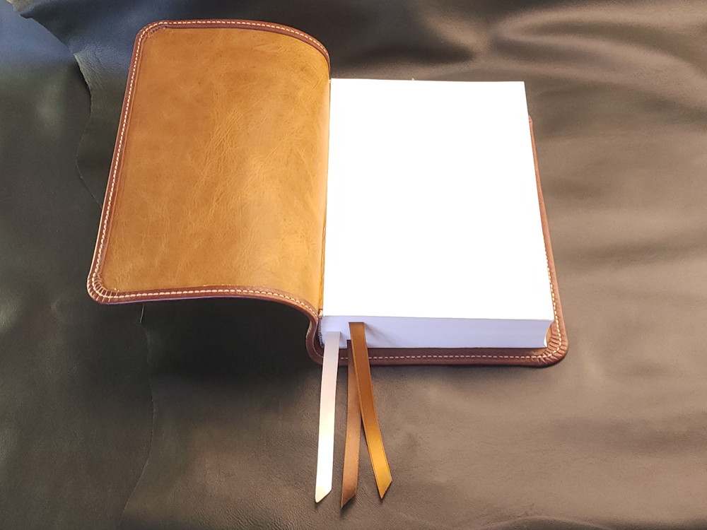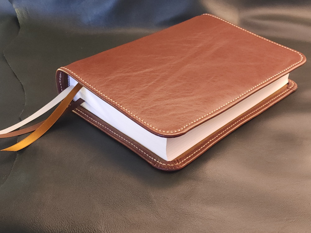 We offer many different Bible editions in several different designs, but we haven’t made every design for every Bible edition we sell (yet!). This means the pictures we display are meant to highlight the custom handcrafted cover rather than the text pages of the Bible (aka the text block) itself. The Bible edition that we’ve crafted the cover for may be different than the Bible edition we’re selling, with different page gilding, thumb-indexing tabs, size, thickness, or other features. As often as we can, we use pictures from Bibles editions with similar features to the Bible editions we’re listing.