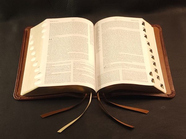 We offer many different Bible editions in several different designs, but we haven’t made every design for every Bible edition we sell (yet!). This means the pictures we display are meant to highlight the custom handcrafted cover rather than the text pages of the Bible (aka the text block) itself. The Bible edition that we’ve crafted the cover for may be different than the Bible edition we’re selling, with different page gilding, thumb-indexing tabs, size, thickness, or other features. As often as we can, we use pictures from Bibles editions with similar features to the Bible editions we’re listing.