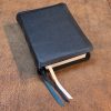 This cover includes a black vegetable-tanned pebbled goatskin that has been specially crafted for bookbinding applications, Badalassi Carlo Ortensia (Aqua blue) waxed Italian cowhide liner, and hand-sewn black perimeter stitching. It also includes three ribbons: the first two are black and teal blue; the third is either gold, silver, or white to match the page edge of the custom Bible we craft for you. The cover’s edges (the yapp) have also been extended to help protect the pages of the Scriptures.