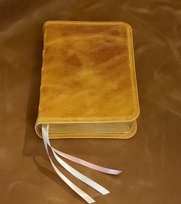 Presenting our luxurious Personal Size Extra Large Print Bible. This cover includes one of the world’s finest cowhide leathers – a distressed cowhide produced by the Balalassi Carlo tannery from Italy – paired with a light pink Italian calfskin. Badalassi Carlo cowhide, tanned at the Badalassi Carlo tannery in Tuscany, Italy, is one of the world’s most luxurious cowhide leathers and is a favorite for bookbinders worldwide. This vegetable-tanned leather includes waxes that are added during the tanning process that result in an exceedingly smooth feel and pull-up effect that is unlike any other cowhide in the world. Adding to this cover’s beauty is hand-sewn colonial brown perimeter stitching and ivory, rose smoke, and dusty pink ribbons!
