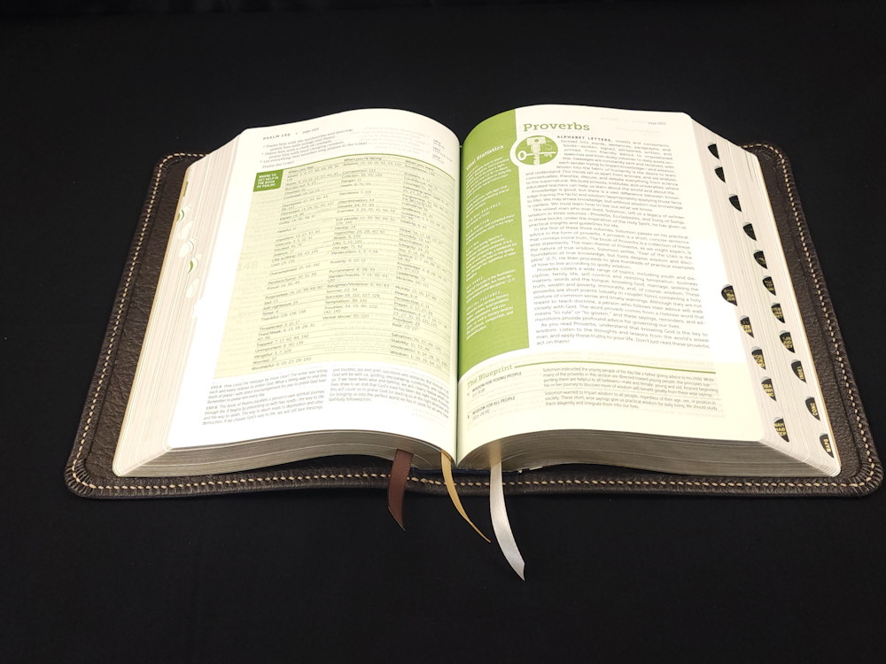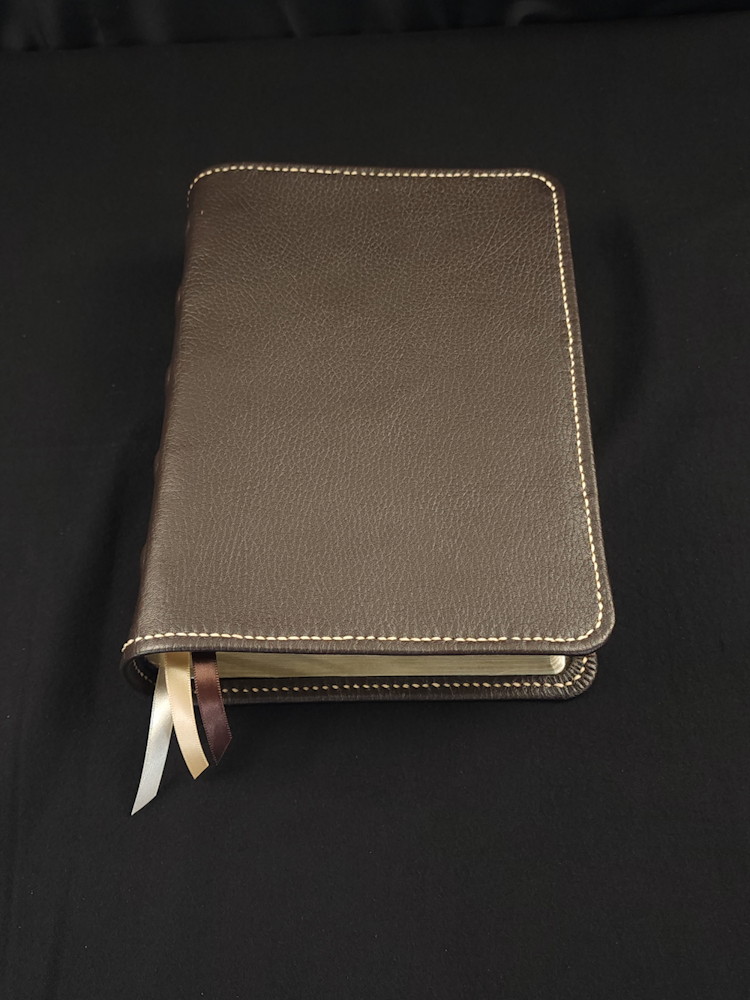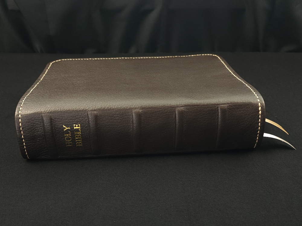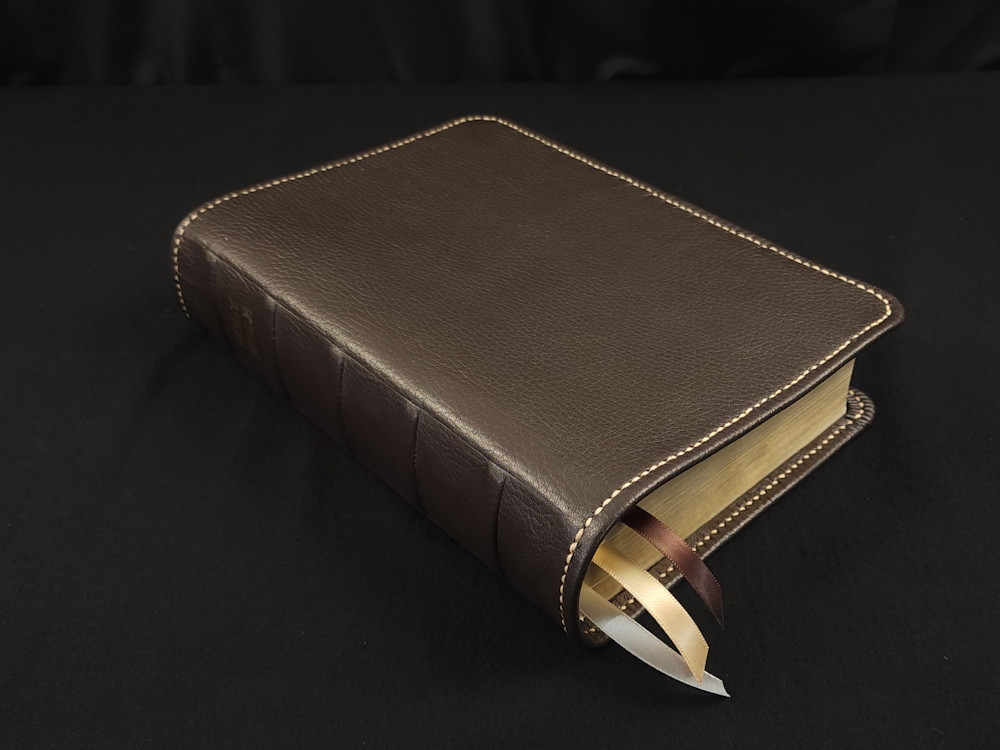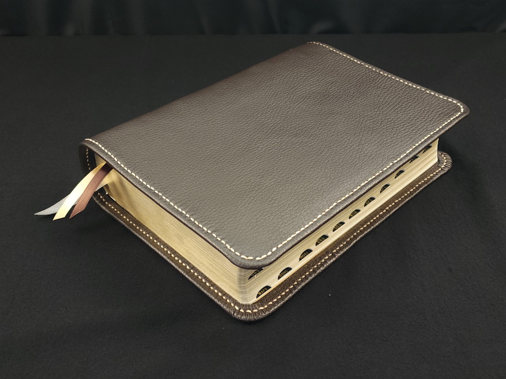 We offer many different Bible editions in several different designs, but we haven’t made every design for every Bible edition we sell (yet!). This means the pictures we display are meant to highlight the custom handcrafted cover rather than the text pages of the Bible (aka the text block) itself. The Bible edition that we’ve crafted the cover for may be different than the Bible edition we’re selling, with different page gilding, thumb-indexing tabs, size, thickness, or other features. As often as we can, we use pictures from Bibles editions with similar features to the Bible editions we’re listing.