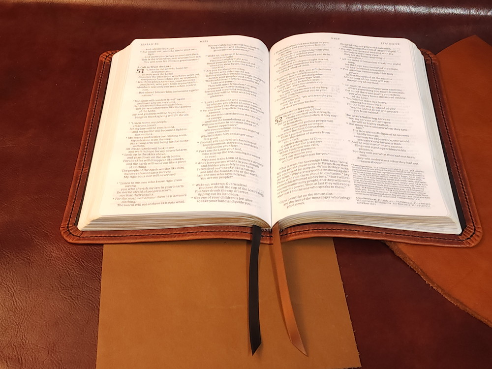 We offer many different Bible editions in several different designs, but we haven’t made every design for every Bible edition we sell (yet!). This means the pictures we display are meant to highlight the custom handcrafted cover rather than the text pages of the Bible (aka the text block) itself. The Bible edition that we’ve crafted the cover for may be different than the Bible edition we’re selling, with different page gilding, thumb-indexing tabs, size, thickness, or other features. As often as we can, we use pictures from Bibles editions with similar features to the Bible editions we’re listing.