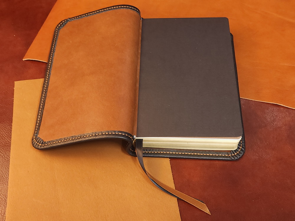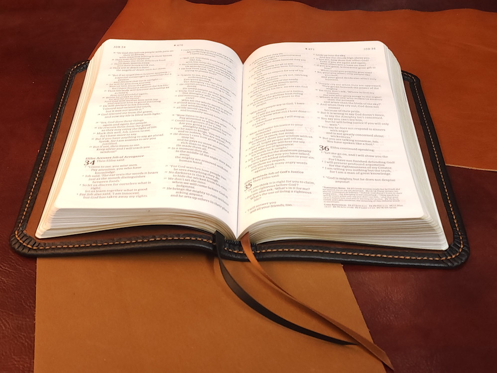 We offer many different Bible editions in several different designs, but we haven’t made every design for every Bible edition we sell (yet!). This means the pictures we display are meant to highlight the custom handcrafted cover rather than the text pages of the Bible (aka the text block) itself. The Bible edition that we’ve crafted the cover for may be different than the Bible edition we’re selling, with different page gilding, thumb-indexing tabs, size, thickness, or other features. As often as we can, we use pictures from Bibles editions with similar features to the Bible editions we’re listing.