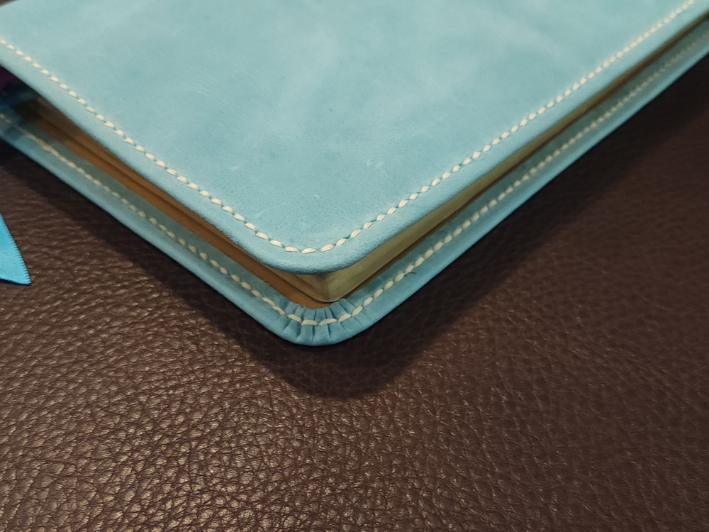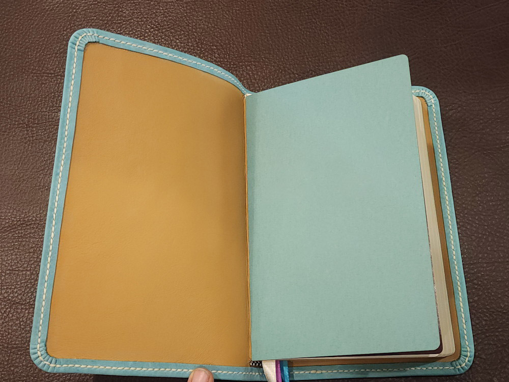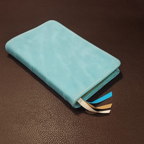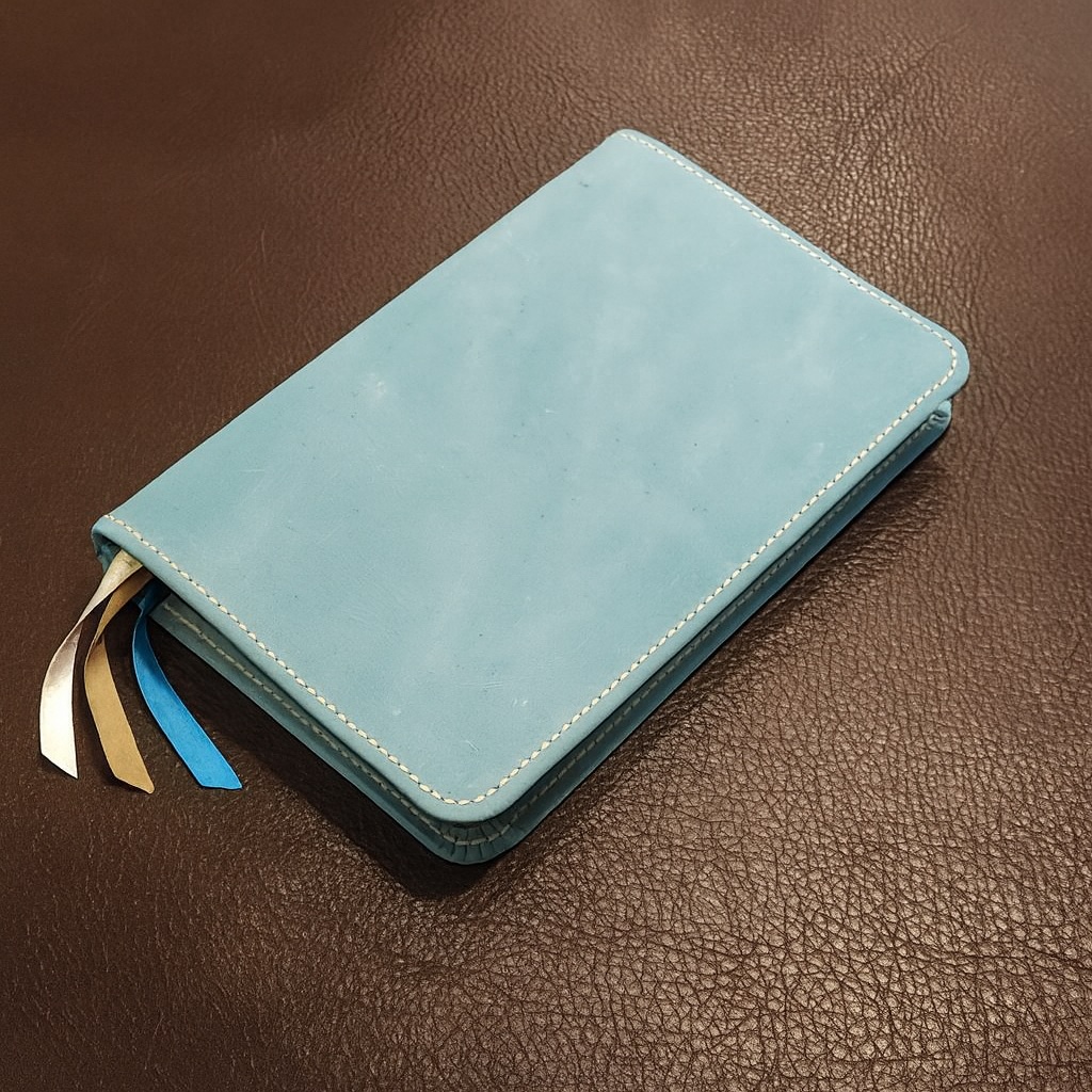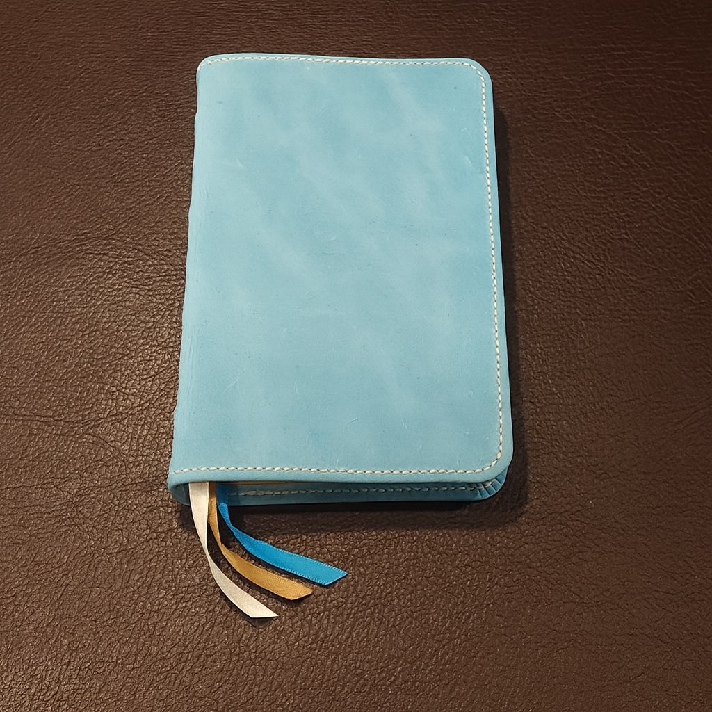 This opulent leather Bible has been masterfully hand-rebound with a light turquoise cover, a camel tan sheepskin liner and a hand-sewn ivory perimeter stitch. Adding to its beauty are mediterranean blue textured linen end sheets, spine stamping, and ribbons in shades of ivory, cerulean blue, and camel tan! It’s more than just a book – it’s a testament to faith and a lifetime companion that is designed to stand the test of time.