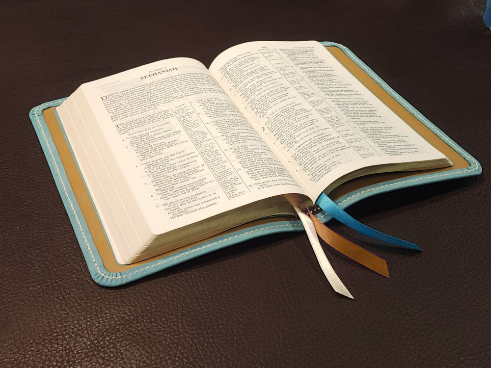 We offer many different Bible editions in several different designs, but we haven’t made every design for every Bible edition we sell (yet!). This means the pictures we display are meant to highlight the custom handcrafted cover rather than the text pages of the Bible (aka the text block) itself. The Bible edition that we’ve crafted the cover for may be different than the Bible edition we’re selling, with different page gilding, thumb-indexing tabs, size, thickness, or other features. As often as we can, we use pictures from Bibles editions with similar features to the Bible editions we’re listing.