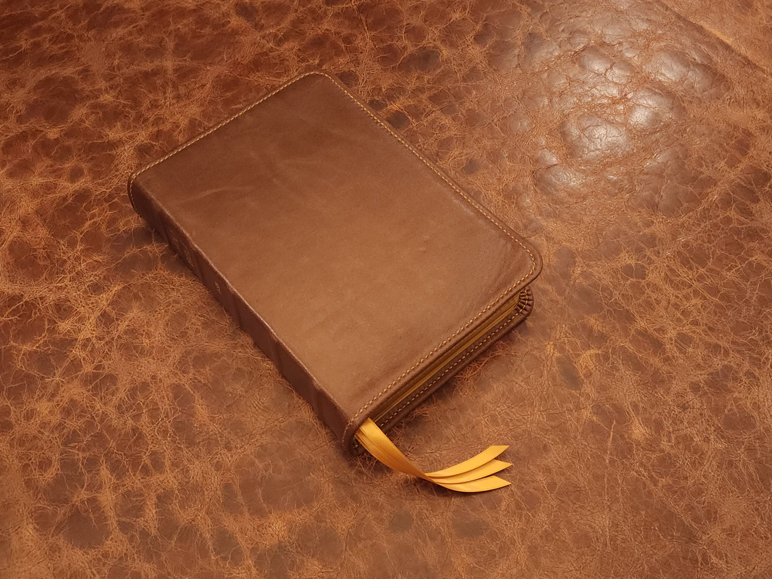 Antiqued brown sheepskin Thinline Bible with camel tan sheepskin liner and three ribbons
