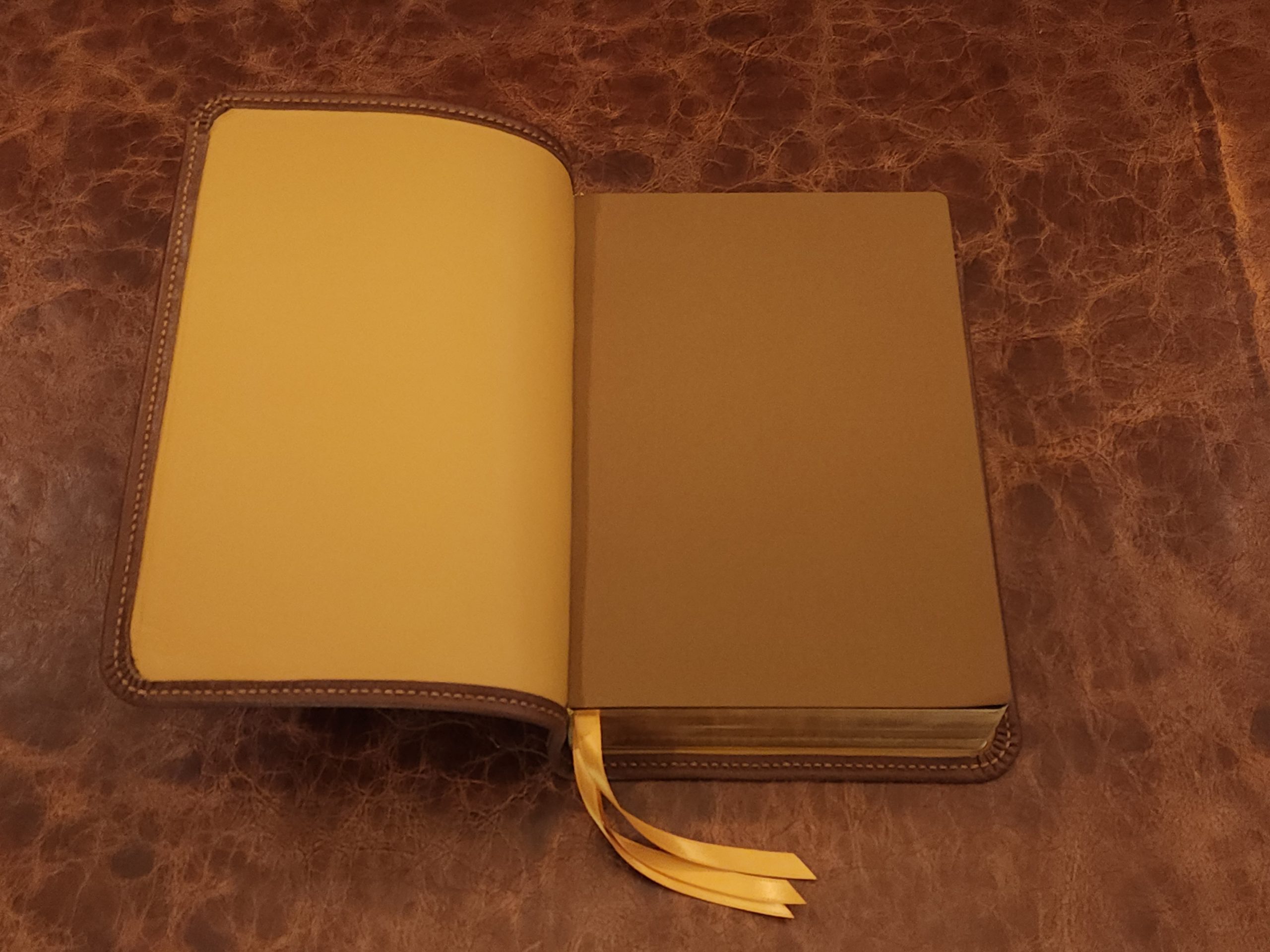 This stunning leather Bible has been masterfully hand-rebound with our antique brown sheepskin cover. This beautiful veg-tanned sheepskin, which comes from Greece, has a slightly pull-up aniline two-tone effect. It is matched with a smooth camel tan sheepskin liner and a hand-sewn light tan perimeter stitch. Adding to its beauty are milk chocolate-brown sheets, five ribs, gold spine stamping, and ivory, spice gold, and three gold ribbons!
