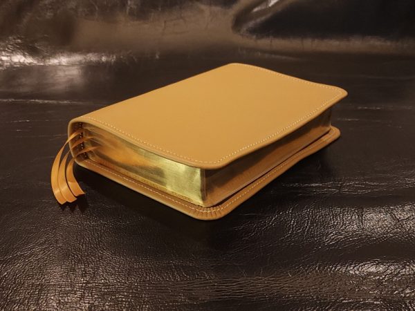 Thinline Bible in camel tan sheepskin leather with antiqued brown sheepskin liner and three ribbons