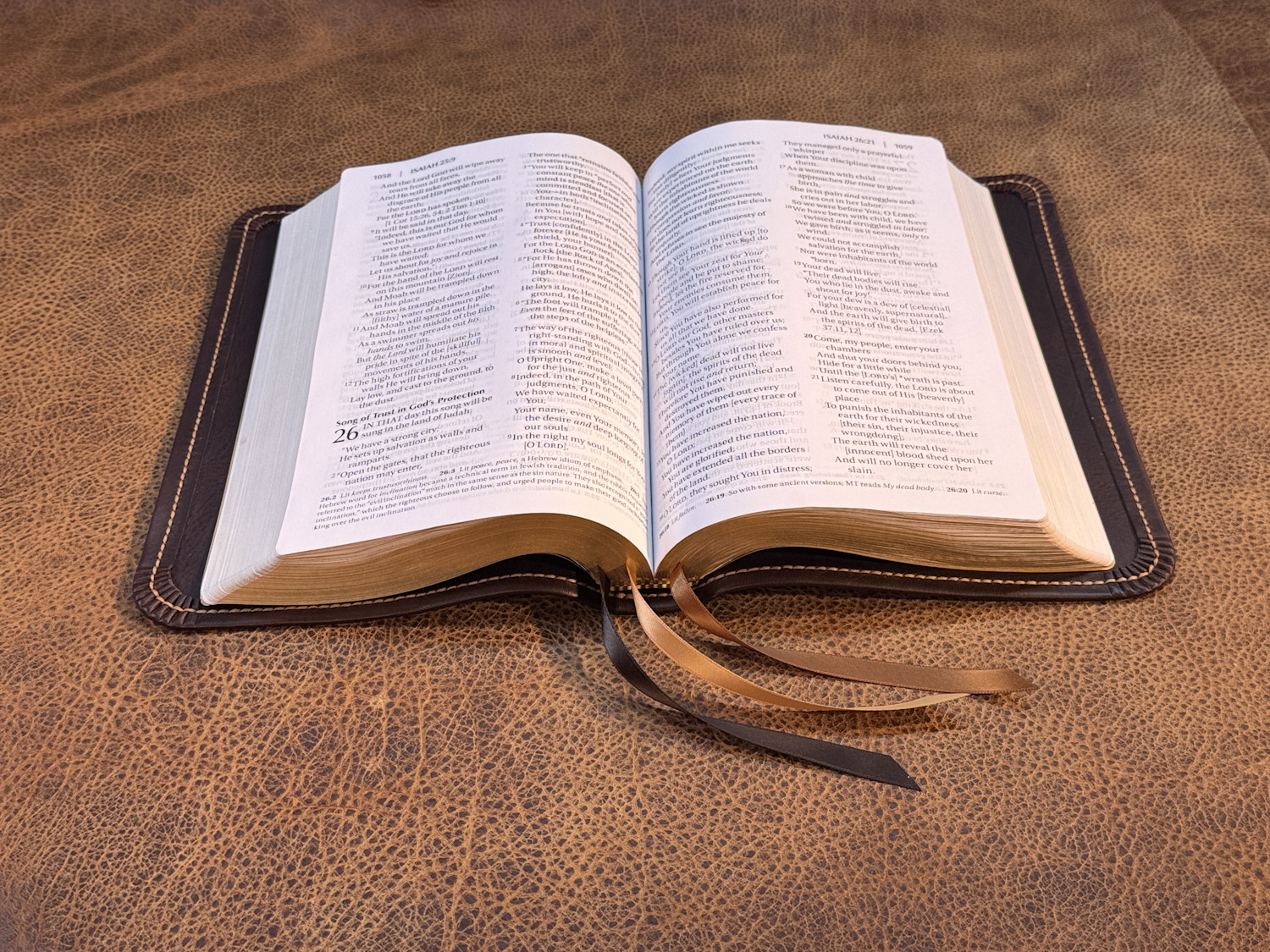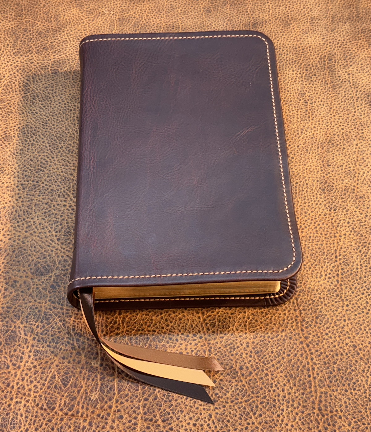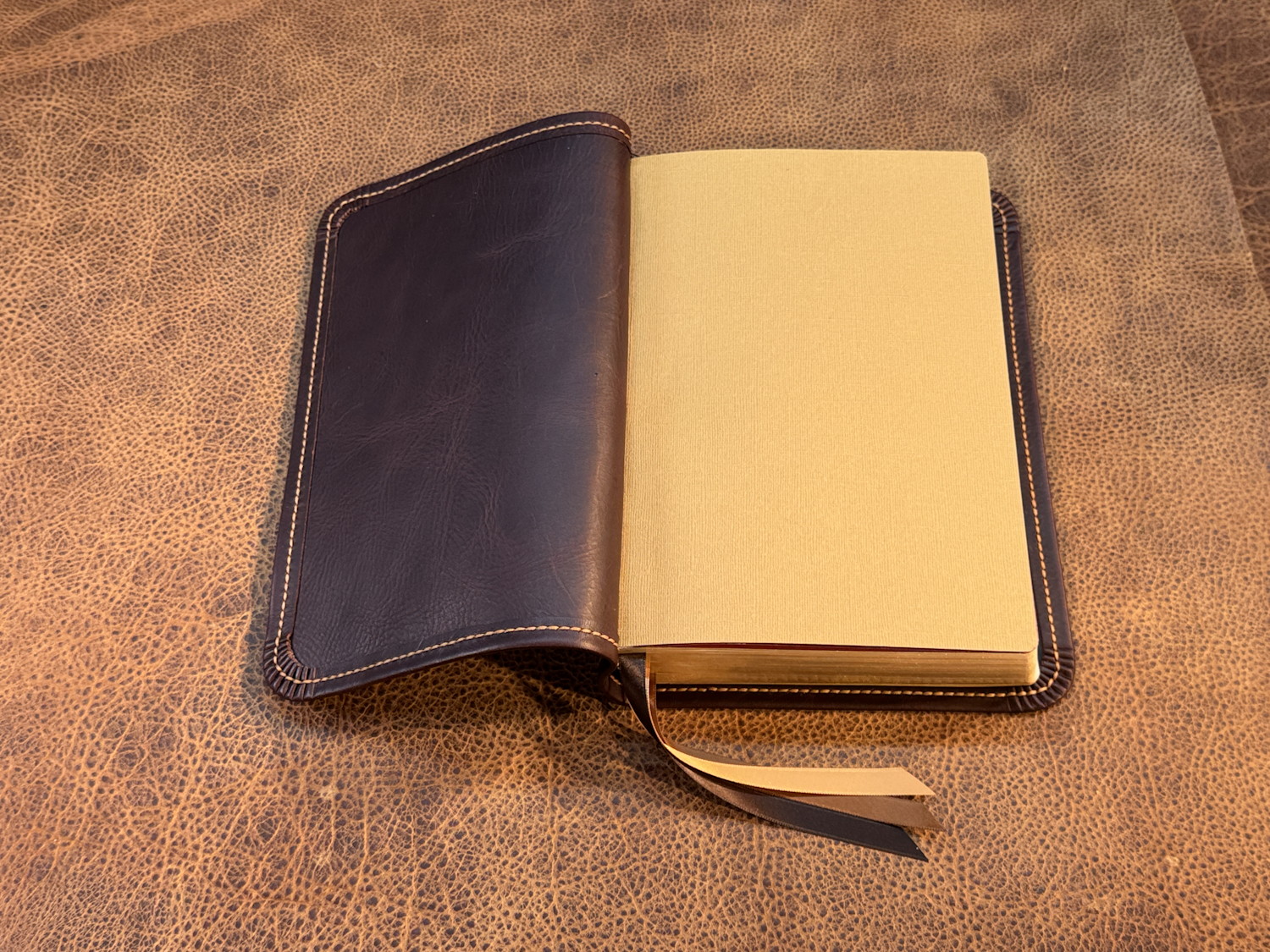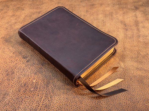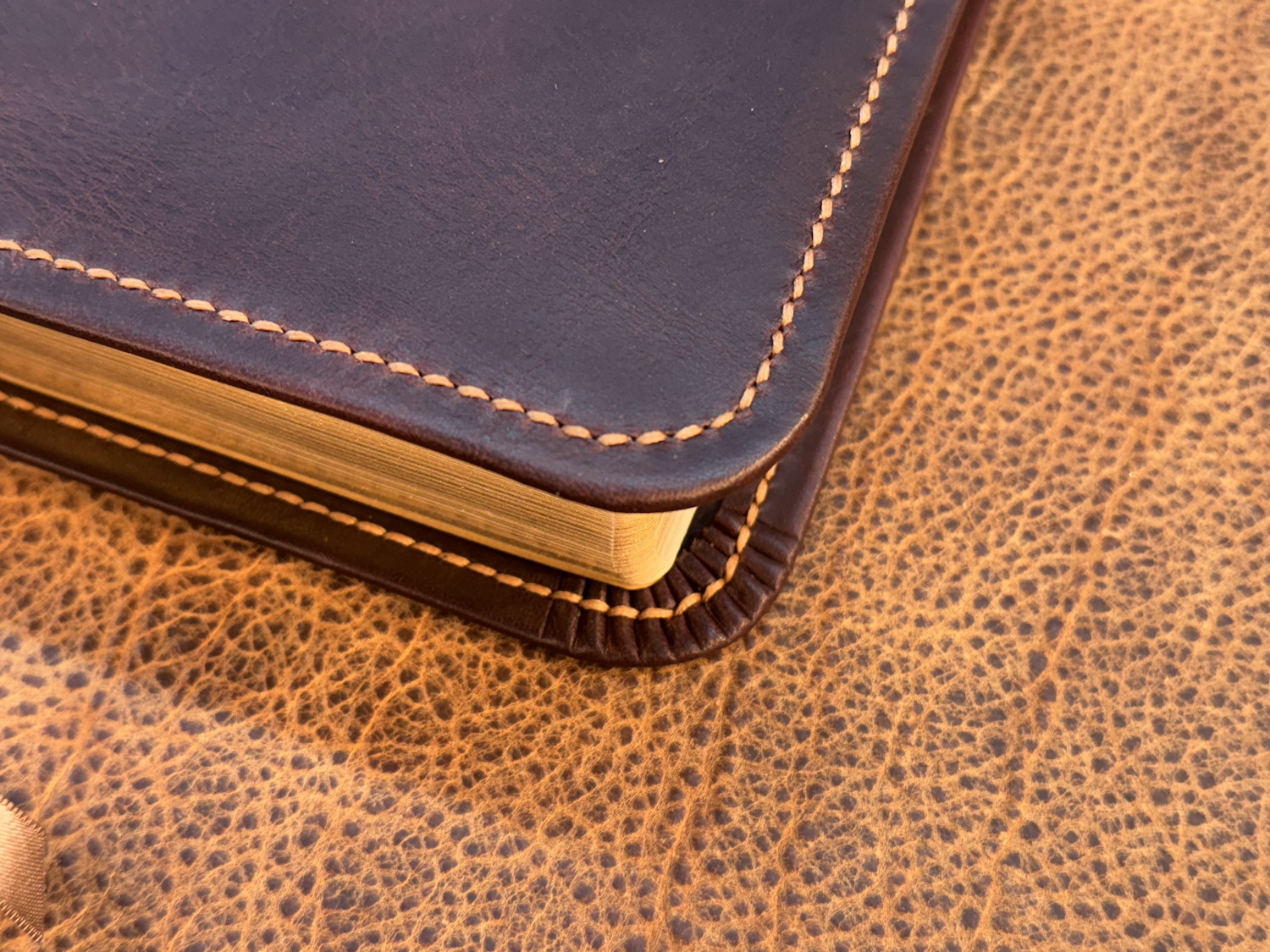 We offer many different Bible editions in several different designs, but we haven’t made every design for every Bible edition we sell (yet!). This means the pictures we display are meant to highlight the custom handcrafted cover rather than the text pages of the Bible (aka the text block) itself. The Bible edition that we’ve crafted the cover for may be different than the Bible edition we’re selling, with different page gilding, thumb-indexing tabs, size, thickness, or other features. As often as we can, we use pictures from Bibles editions with similar features to the Bible editions we’re listing.