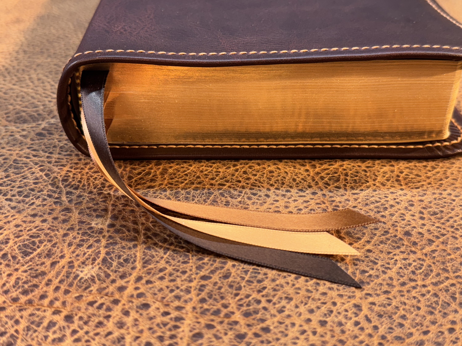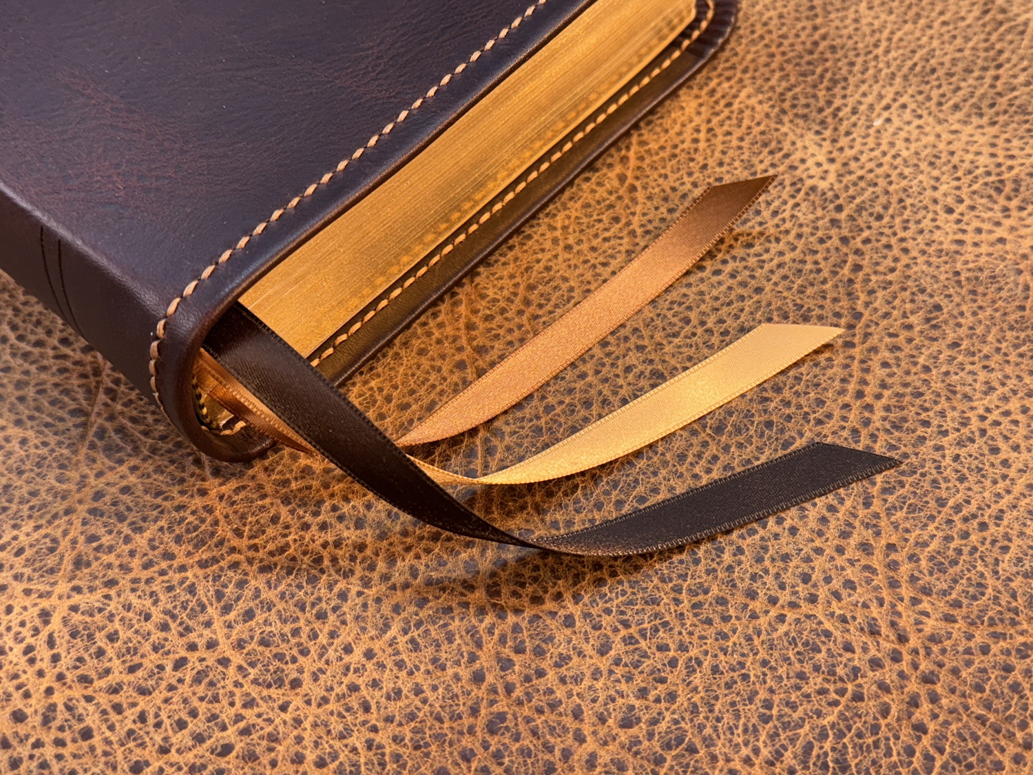 This opulent leather Bible has been masterfully hand-rebound with a tobacco brown Badalassi Carlo cowhide cover and liner and an exquisitely hand-sewn honey brown perimeter stitch. This leather comes from the Badalassi Carlo tannery in Tuscany, Italy, and is vegetable tanned using traditional tanning methods of tanning with tree barks that go back hundreds of years. Enhancing its beauty are hazelnut tan end sheets, brown, coffee, and camel tan satin ribbons, and laser-engraved faux ribs!